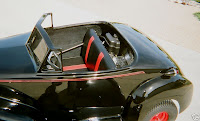 The paint is a high gloss black enamel that has been colored sanded and buffed out to a better shine than most classic cars ever get and at a cost of over $1,500. The mags are painted steel with brand new multi ply tires and look fantastic as does the brand new upholstered seat with red racing stripes on it to match the custom red pin stripping. This little go cart also has a electronic push button starter and push button stop too… It also has a disc brake, working head lights and tail lights, plexy glass windshield and removable convertible top.