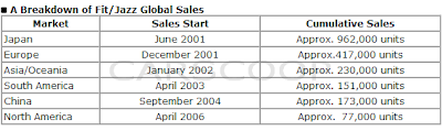 Just as Mazda announced that its Japanese production reached 40 million units, Honda came out with an official press release informing us that the worldwide cumulative sales of Fit /Jazz automobile reached 2 million units at the end of June 2007, exactly six years after it was introduced in the Japanese market. Called Fit in Japan, North America, South America and China and Jazz in Europe and Asia/Oceania, Honda’s sub-compact model is now available in 115 countries, manufactured at 6 facilities in 5 different countries and delivered to some 400,000 customers annually. -Breakdown of Jazz / Fit global sales after the jump